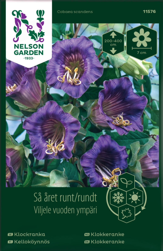 Klokkeranke med dypt blålilla blomster. Fin på solfylt sted på balkong eller terrasse. Kan dyrkes som potteplante. Bløtlegg frøene i lunket vann i en time før såing. Trenger støtte.